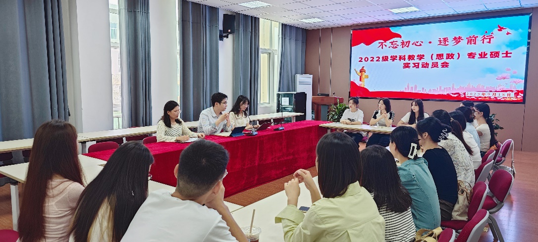 为进一步加强教育硕士实习规范化管理、提升实践环节质量,10月18日上午,在经管楼310召开了2022级学科教学(思政)专业硕士实习动员会,会议由副经理俞彤晖主持,研究生工作秘书何凤,研究生专职班主任刘梦北以及2022级学科思政班同学参与本次会议。