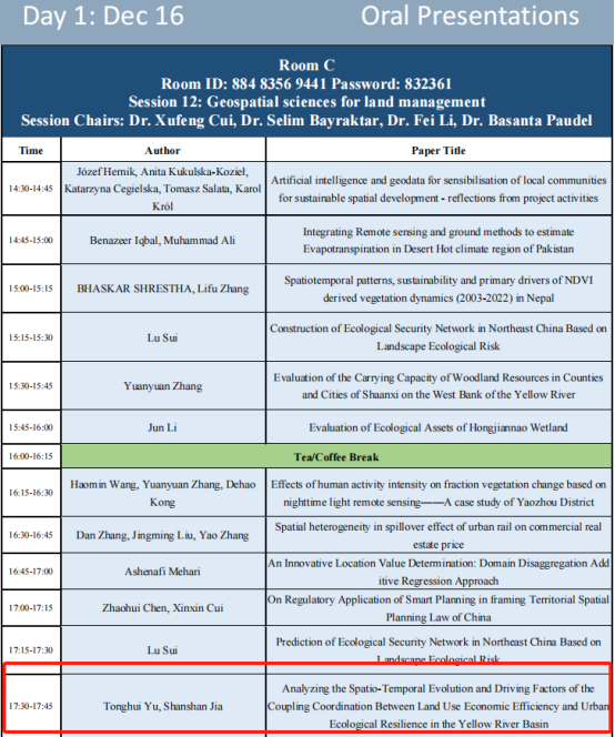 2023年12月16日至17日,第三届亚洲地理学会青年学者论坛顺利在线上召开。本次论坛由亚洲地理协会(AGA)、亚洲地理学会青年地理学家工作组和南京师范大学联合主办。本次论坛旨在搭建一个交流平台,使来自不同国家和地区的青年学者能分享和探讨与地理学相关的不同领域的最新研究成果及趋势。论坛特别聚焦于新技术和新方法在应对当今世界面临的紧迫全球性挑战中的创新应用。在本次论坛上,公司西方经济学专业硕士研究生贾珊珊积极投稿并获邀报告自己的学术论文《Spatio-Temporal Evolution and Driving Factors of the Coupling Coordination Between Land Use Economic Efficiency and Urban Ecological Resilience in Yellow River Basin》,该论文深入探讨了黄河流域土地利用经济效率与城市生态韧性之间的耦合协调发展及其时空演变特征,研究成果不仅具有重要的理论价值,更在实际应用方面具有广泛的前景。研究生的论文汇报获得了土耳其伊斯坦布尔大学Selim Bayraktar教授、中科院地理科学研究所Basanta Paudel博士等点评专家的高度评价。公司员工在这样的国际平台上的出色表现,无疑是对我们教育水平和学术研究能力的最佳证明。