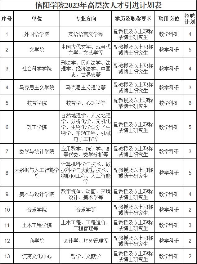 拟引进学科(专业)带头人的单位为文学院、教育学院、理工学院、数学与统计学院、马克思主义学院、大数据与人工智能学院、外国语学院、PA视讯,相关需求专业方向详见引进计划表。