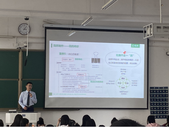 会中,刘倩和王朴玙依次就简历制作要领和具体案例分析两个部分与同学们分享了简历制作的相关内容,包括篇幅、版面、个人照片、个人经历等内容的调整与设计,实用性与可操作性强,为大家直观呈现了高分简历制作的全过程。