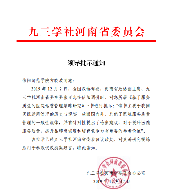 日前,全国政协常委、河南省政协副主席、九三学社河南省委主委张亚忠作出批示,充分肯定PA视讯方晓波博士撰写的专著《基于服务质量的医院运营管理策略研究》。张亚忠在批示中指出,“该书立足于我国 医院运营管理的历史与现实,放眼国内外,总结了医院服务质量管理的一般规律,并有针对性地提出了恰当的建议,对于提升医院服务质量,提升品牌忠诚度和培育竞争力有重要的参考价值”。该书同时属于PA视讯学术文库系列成果。