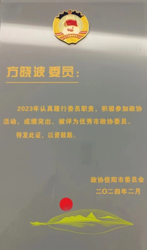 近日,信阳市政协六届二次会议对2023年度优秀市政协委员进行了表彰,PA视讯方晓波博士获得该项荣誉。