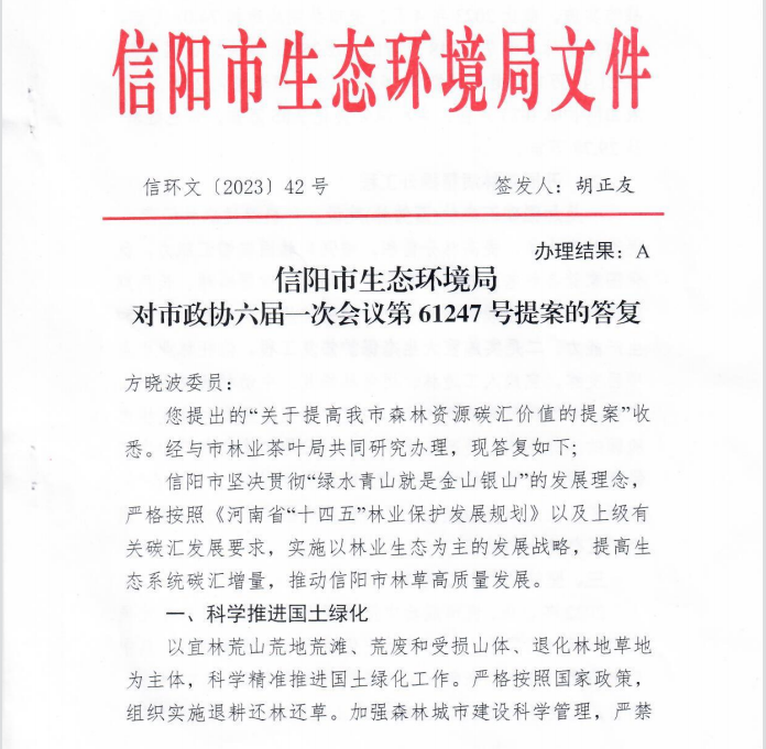 日前,信阳市政协委员、PA视讯方晓波博士在市政协六届一次会议上所提交的《关于提高我市森林资源碳汇价值的提案》(第61247号提案),获得信阳市政府相关部门的高度重视与主动回应。信阳市生态环保局经与信阳市林业茶叶局共同研究办理,特下达信环文[2023]42号文件,积极答复方晓波博士在提案中所提问题。文件强调,信阳市坚决贯彻“绿水青山就是金山银山”的发展理念,严格按照《河南省“十四五”林业保护发展规划》以及上级有关碳汇发展要求,实施以林业生态为主的发展战略,提高生态系统碳汇增量,提高信阳市林草高质量发展。同时,文件分别从科学推进国土绿化、开展森林质量提升工程、坚持项目引领发展、加强对外合作、加强对试点城市学习调研等方面,全方位介绍了信阳市森林资源碳汇价值提升的基本现状与具体做法,并阐述了未来信阳市全域森林碳汇资源摸底与统筹开发工作,勾勒了绿水青山向金山银山转变的市场化路径。