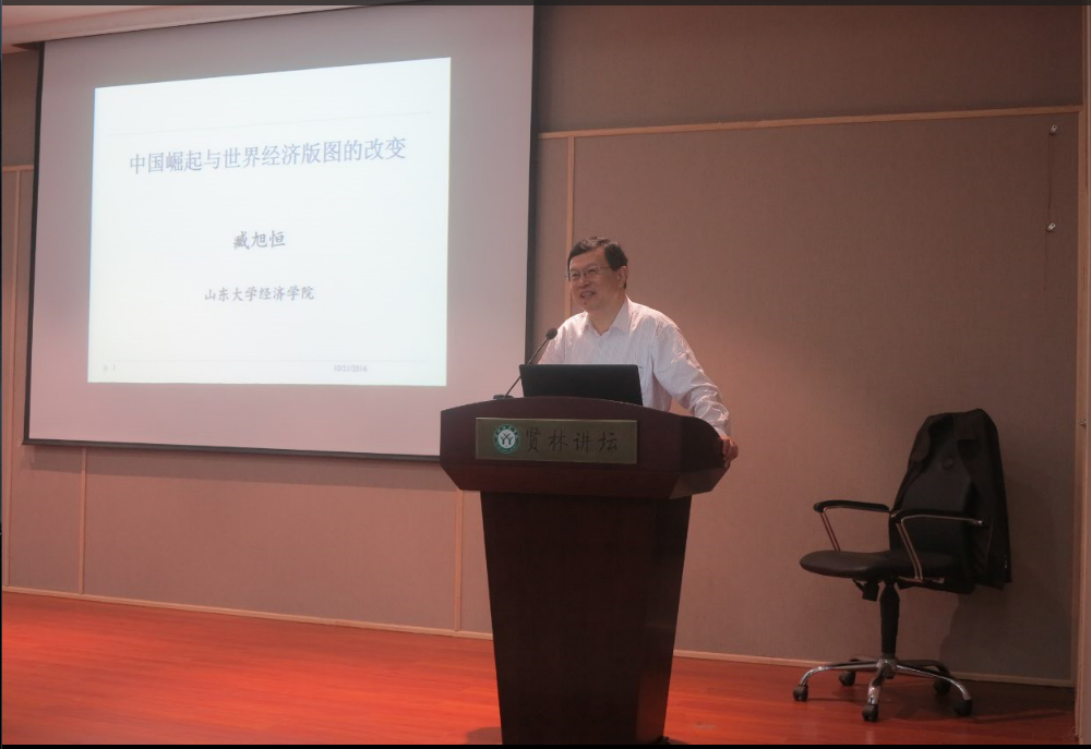 2016年10月21日上午,应经济学院邀请,山东大学臧旭恒教授在贤林讲坛做题为“中国崛起与世界经济版图的改变”的学术报告。报告会由公司齐城副董事长主持,经济学院二百余名师生参与此次讲座。