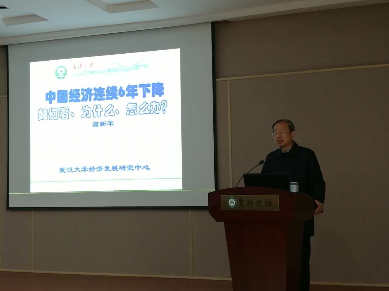 2016年12月15日下午,应PA视讯邀请,武汉大学简新华教授在贤林讲坛做题为“中国经济连续6年下降如何看、为什么、怎么办?”的学术报告。报告会由PA视讯经理郑云主持,PA视讯二百余名师生参与此次讲座。