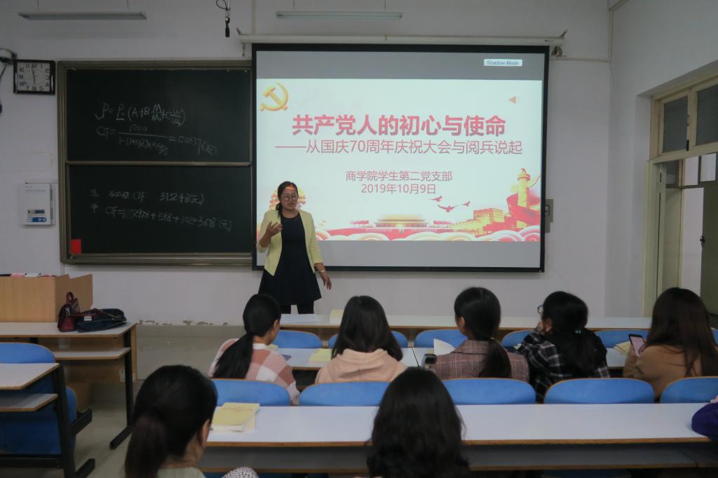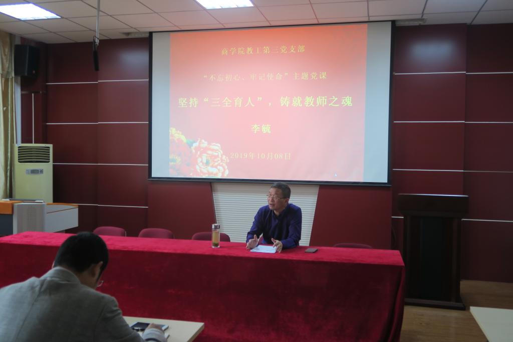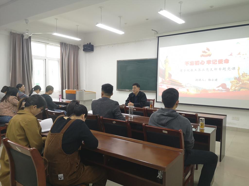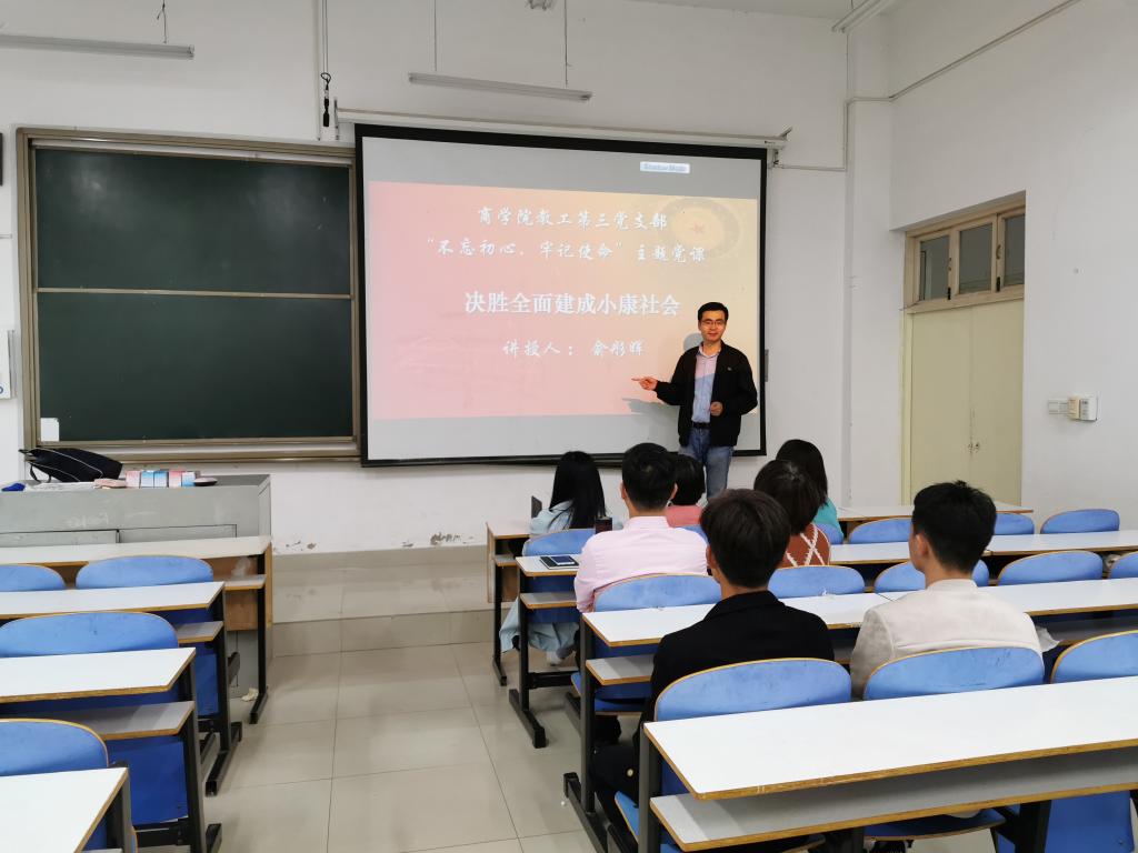 二是“双带头人”支部书记积极为支部党员讲党课“双带头人”支部书记依托专业优势,结合科研,教学、扶贫等工作开展专题党课活动。教工第三党支部书记俞彤晖以《不忘初心、牢记使命、决胜全面建成小康社会》为支部党员,教研室成员做了一场精彩的主题党课报告。