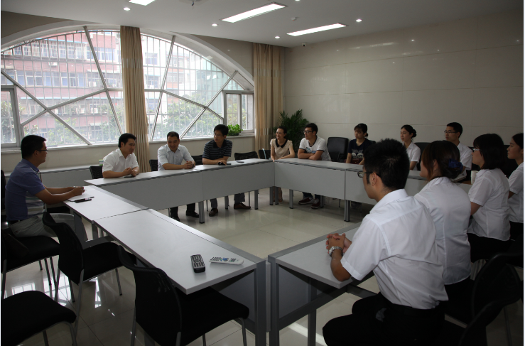 抵达银行后,王建旭、房加帅一行在该行行长的陪同下参观了银行机构设置与实习办公环境,边看边与周围员工亲切交流,询问其实习心得与工作生活中所面临问题。参观结束后在会议室召开了座谈会,首先王行长对信阳师范学院能够为其银行输送素质高、业务强的人才表示感谢,他表示这是一次愉快的校企合作,实现了共赢,并对实习生的工作安排、业务分配做了简要介绍。随后房加帅对该行能够为学子提供宝贵的实习机会表示感谢,他指出公司在全国网络商务创新应用大赛所取得的优异成绩离不开邮储银行的大力支持与悉心指导,将与邮储银行继续密切交流,共同为培养专业素质人才而努力。最后王建旭做总结讲话,他代表公司向邮储银行多年来对公司社会实践工作的支持表示感谢,对公司富有特色的实践活动表示充分肯定,向参加暑期社会实践活动的同学们致以亲切的问候。他强调老员工暑期社会实践活动是公司实践育人的重要手段,也是公司多年来长期坚持的优良教育传统,老员工只有贴近基层,贴近群众,贴近实际,才能不断增强责任感和使命感,是学习和工作不断前进的动力。他向实习同学提出四点希望,一要牢牢树立安全第一思想,不断增强自我保护意识,确保实践活动安全顺利开展;二要珍惜把握宝贵的实践机会,脚踏实地,勤思多问,努力提高专业技术水平和自身发现问题、分析问题和解决问题的能力;三要注重发挥团队优势,敢于吃苦,团结一心,用智慧和汗水换取社会实践活动的丰硕成果;四要发扬师院光荣传统,以实际行动展现当代师院学子积极进取、健康向上的精神风貌,为公司增光添彩。