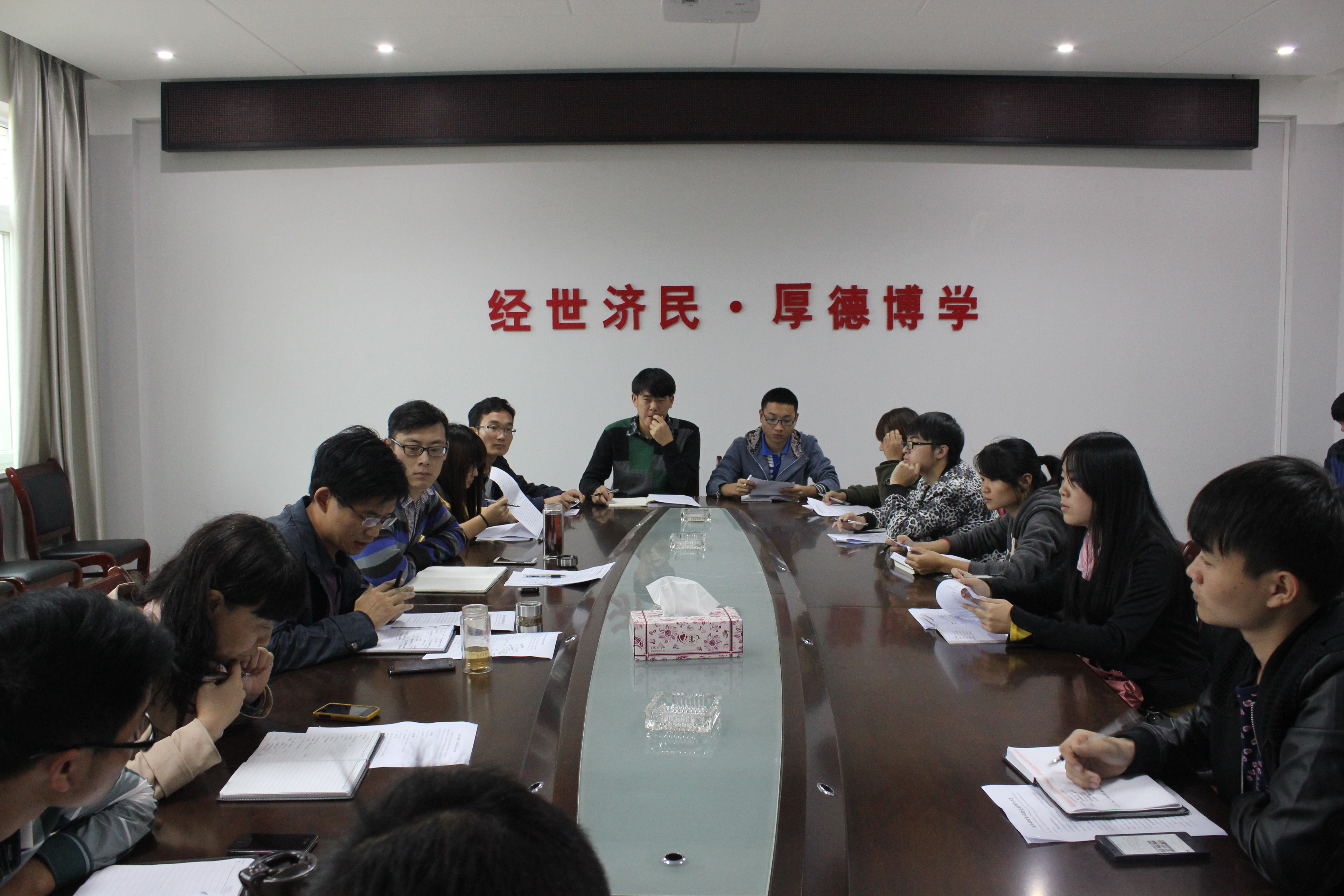 本次会议的议题是:讨论《经济学院学风建设奖惩试行办法》。会议开始后,员工党支部负责人于荷荷、团总支副书记石琳峰、员工会主席时俊、社联主席关超对本月工作进行总结并汇报下个月的工作计划。在听完员工负责人汇报后,房书记对各部门本月工作所取得的成就表示充分肯定,并希望今后再接再厉。随后陈艳丽宣读了《经济学院学风建设奖惩试行办法》(以下简称《办法》),员工负责人认真倾听,不时记录,并在房书记的主持下对《办法》进行逐条讨论。讨论过程中员工负责人就《办法》的可行性畅所欲言,各抒己见,提出了许多中肯具有建设性意见,房书记、张老师、陈老师也详细谈了个人对《办法》的看法,并及时回应同学们提出的问题,整个讨论过程气氛热烈、互动积极。房书记在总结讲话中强调,要高度重视《办法》,这是今后开展员工工作的重要政策依据,是促进学风建设的重要举措,希望各位员工负责人私下继续认真讨论,不断完善《办法》,共同为经济学院的员工工作作出贡献。会议还研究了员工活动经费、展板购置、女生月活动等问题。