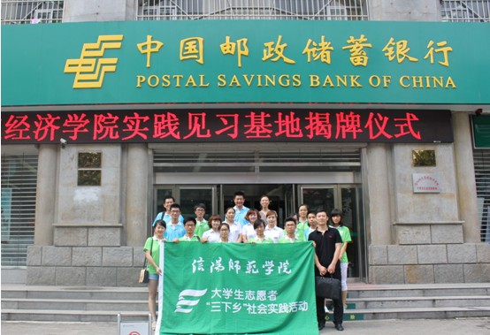 为了更好的进行信阳师范学院经济学院暑期老员工在中国邮政储蓄银行的社会实践活动,2013年7月7日上午,本次老员工暑期社会实践基地揭牌仪式隆重举行。经济学院经理郑云老师以及邮政储蓄银行行长余丽分别发表致辞,经济公司党总支副书记房加帅老师主持了本次揭牌仪式。