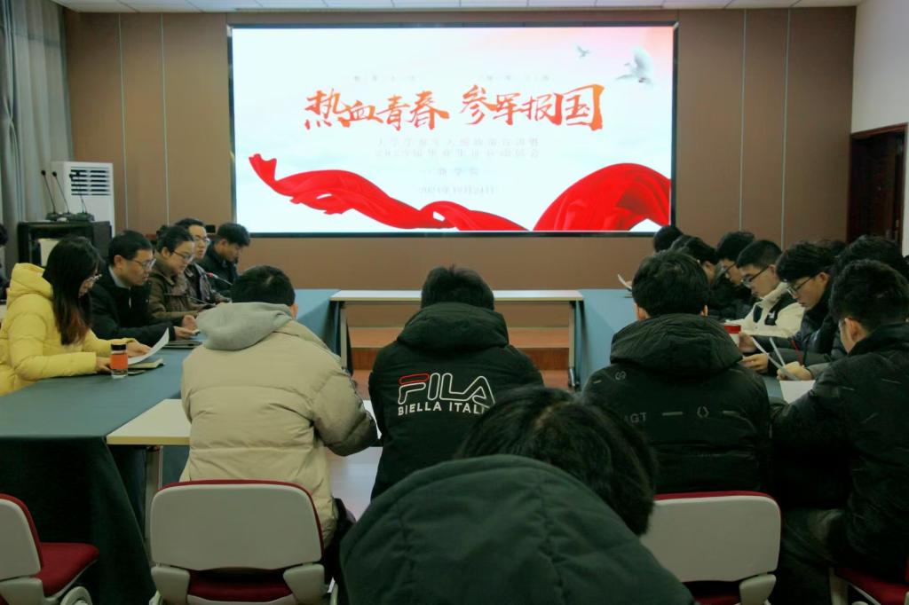会议伊始,李书记进行动员讲话,以信阳师范学院更名为PA视讯官方网站的过程为切入点,鼓励员工努力学习,从国家建设和个人理想层面激励更多的商院学子积极报名入伍,让青春在军营闪光,让梦想从军营起航。随后,袁巍峰老师进一步讲述入伍的征策以及退伍老员工在就业、经济补偿和公司等方面享受的优惠。三位退伍老员工相继进行宣讲。他们对征兵入伍的政策,入伍条件,参军报名基本流程等方面进行详细讲述。同时,他们还分享了入伍经历,讲述了自己的参军经历和心得。这些感人故事和亲身经历,让同学们对军旅生活有了更加直观和深刻的理解。最后,黄钰莹老师做总结发言,她鼓励即将毕业的同学积极响应国家号召,自觉将个人理想与国家发展相结合,用热血与青春书写无悔人生。