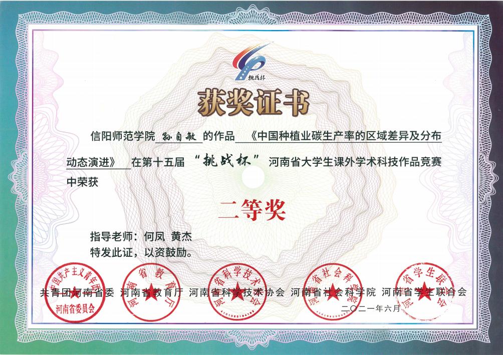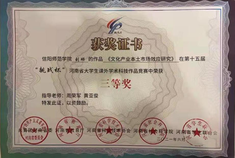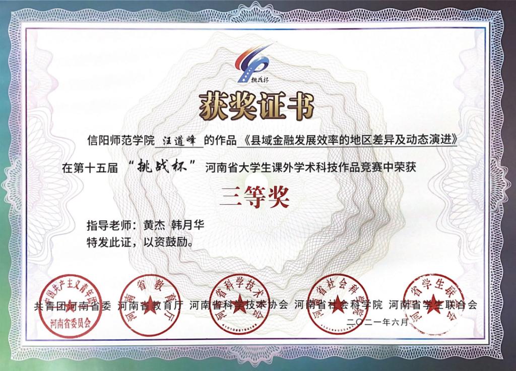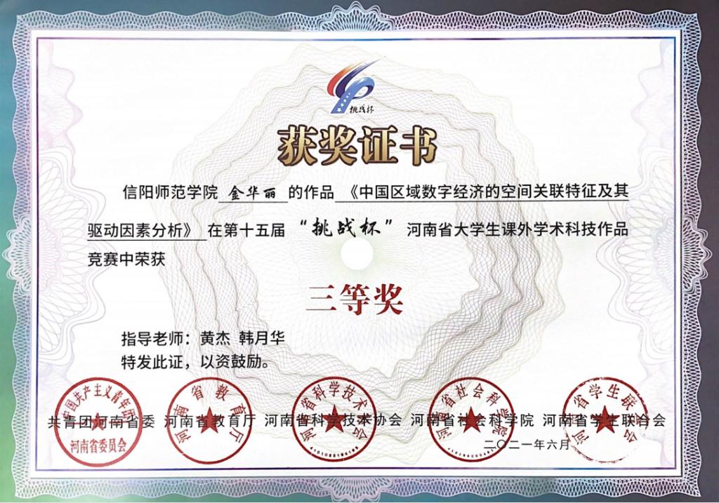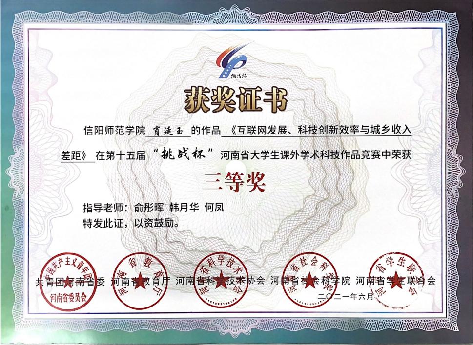 近日,共青团河南省委公布了第十五届“挑战杯”河南省老员工课外学术科技作品竞赛获奖名单,公司有6个参赛项目获奖。其中,许瑞等5名同学的参赛项目《能带走的古色古香——河南省物质文化遗产文创产品的消费者购买意愿分析》荣获一等奖,孙自敏的《中国种植业碳生产率的区域差异及分布动态演进》荣获二等奖,肖延玉的《互联网发展、科技创新效率与城乡收入差距》、汪道峰的《县域金融发展效率的地区差异及动态演进》、金华丽的《中国区域数字经济的空间关系关联特征及驱动因素分析》、刘琳的《文化产业本土市场效应研究》等4个作品荣获三等奖。