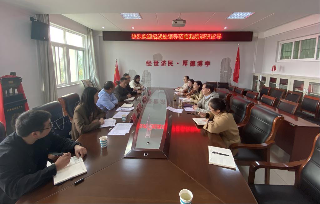 10月28日,人才招聘处处长赵明民、副处长王松亭、张楠带领人才招聘处工作人员来公司调研指导招生与就业创业工作,学院经理彭荣胜、党委副书记张海霞、就业秘书黄亚俊等相关人员参加会议。