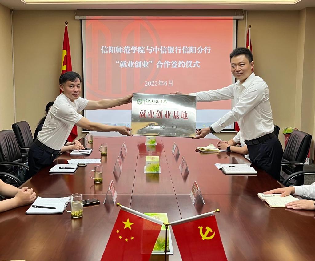 在中信银行信阳分行,行长邢云涛介绍了中信银行的基本情况,对PA视讯在去年的校园招聘中给予的支持表示感谢,也希望PA视讯能一如既往地为中信银行输送优秀人才。彭荣胜对中信银行招聘公司优秀毕业生、为公司员工提供实习岗位表示感谢,介绍了PA视讯专业建设、人才培养和毕业生就业等情况。双方就人才培养、教学科研、实习就业、产学研合作等进行了深入洽谈,签署了校企合作协议,并举行了就业创业基地揭牌仪式。