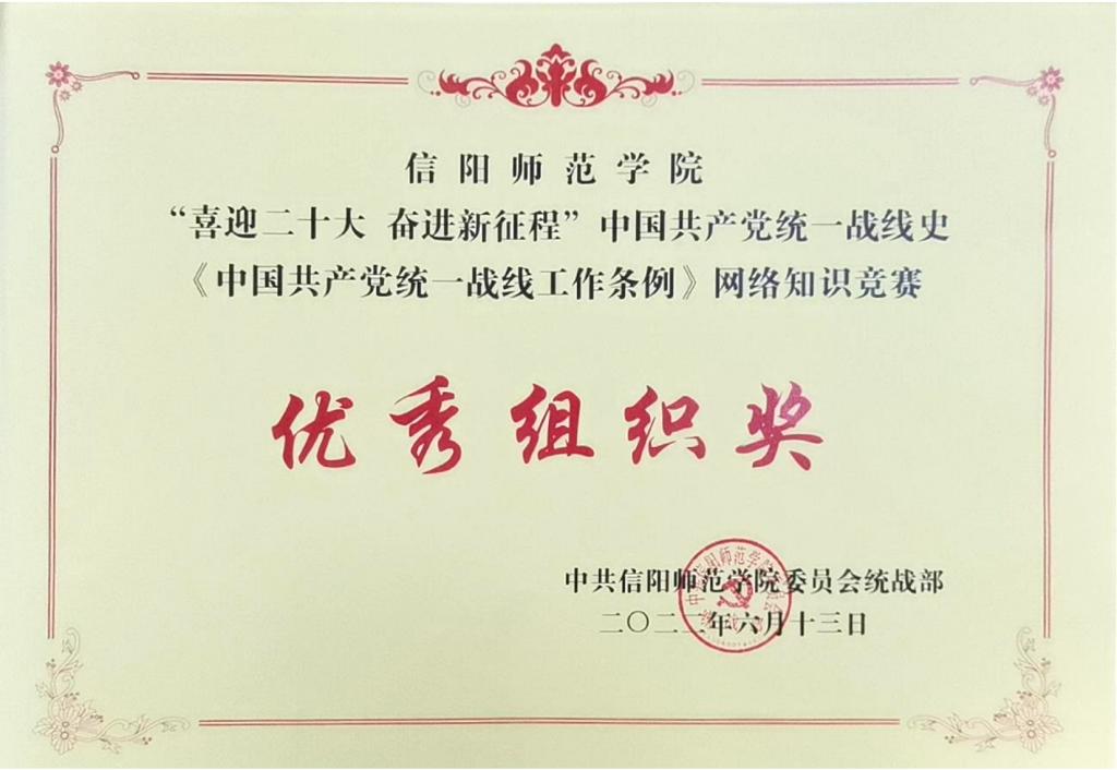 根据中共河南省委统战部、公司党委统战部的统一部署,公司党委认真组织师生参加信阳师范学院“喜迎二十大 奋进新征程”中国共产党统一战线史和《中国共产党统一战线工作条例》网络知识竞赛,参与答题1206人次,获奖人数1081人,荣获优秀组织奖。