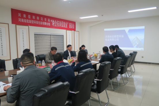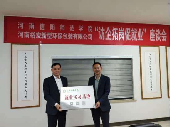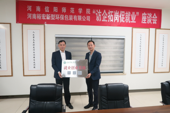 访企拓岗过程中,彭荣胜一行在裕宏包装总经理马智会陪同下参观了裕宏包装及生产现场。参观结束后,彭荣胜一行和河南裕宏新型环保包装有限公司相关负责人进行了座谈。座谈会上,马智会对彭荣胜一行表示欢迎,并详细介绍了公司的成长历程和发展规划。彭荣胜介绍了学院的专业设置、团队建设、团队队伍和人才培养情况。刘义介绍了遂平县营商环境、产业政策。大家就校企合作与校地合作、人才培养与实习就业、企业绿色发展与转型升级、产学研合作等进行了深入细致的沟通交流。随后,彭荣胜、马智会代表双方签属合作协议,举行信阳师范学院“就业创业基地”、“就业实习基地”牌匾授牌仪式。